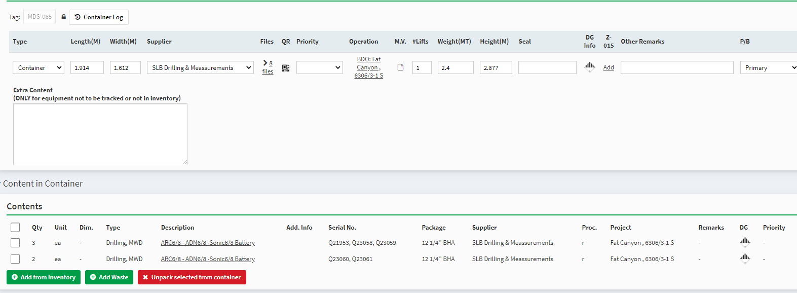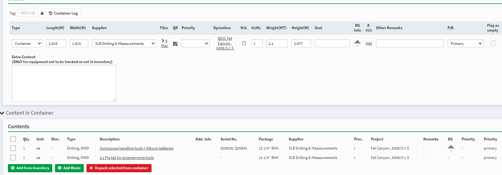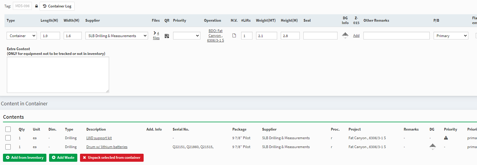 Schlumberger D&M sending out several 8ft containers with lithium batteries, programming tools, LWD support kit, drum w/ lithium batteries and sonic 6/8 batteries.